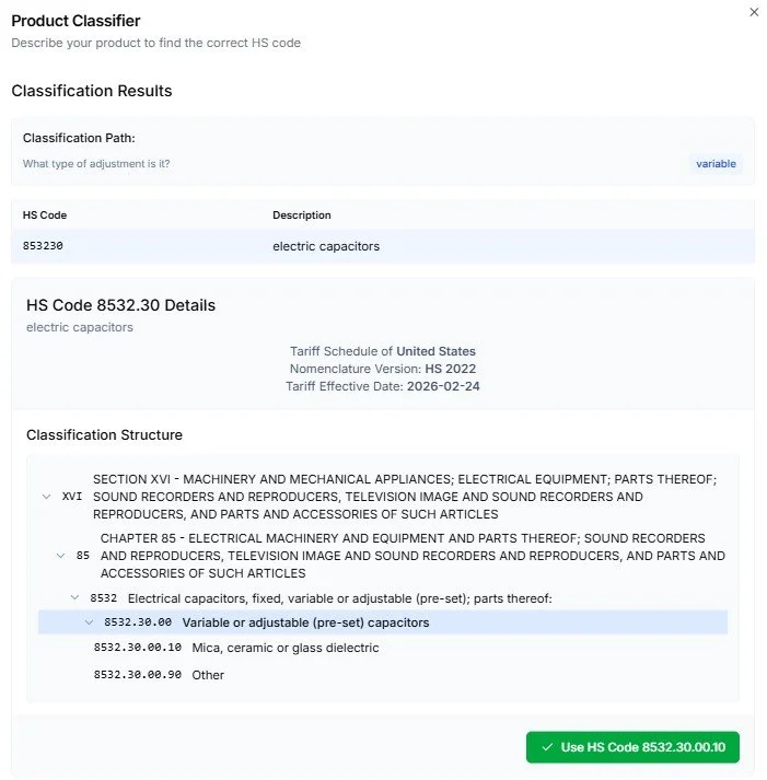 In this example, TariffBuster’s™ artificial intelligence agent determines with a high degree of accuracy that the Harmonized System (HS) Code for this commodity is 8532.30.00.10.