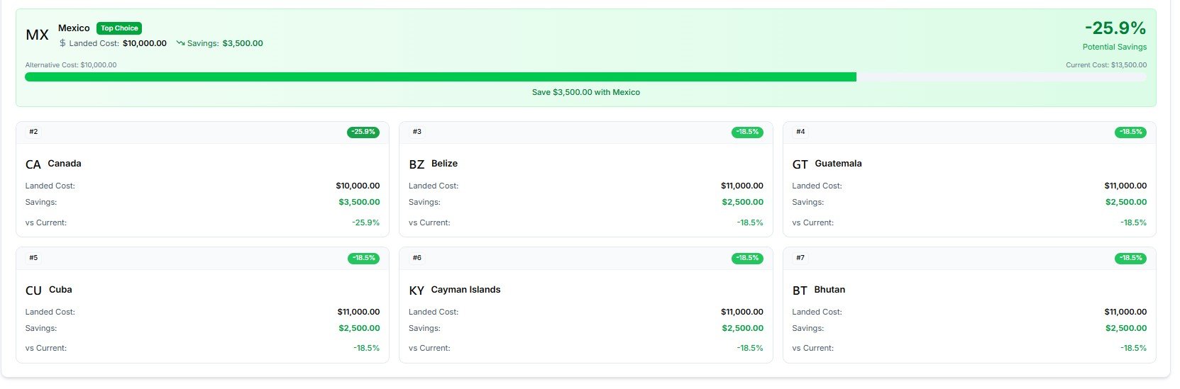 TariffBuster™ goes beyond calculation by automatically suggesting alternate sourcing countries where identical commodities can be procured at significantly lower duty rates. In this example, -if Mexico is viable for sourcing the same capacitors, then an estimate 25.9% in savings could be achieved, unlocking the predictable insight you need to maximize profit and stay ahead of the curve.