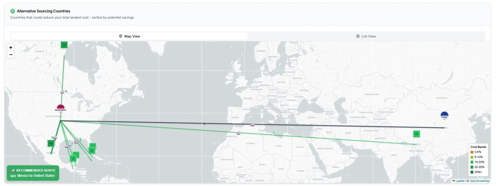 TariffBuster™ can then calculate the landed cost in the next step. Upon entering the value for duty, Tariff Buster instantaneously calculates the estimated landed cost, incorporating the most current and complex tariff and duty rates. In this example scenario we see a Customs duty of 35% will be applied upon import with estimated duty and taxes owed to be $3500 USD. This breaks down to a Section 99 Temporary Import Surcharge of 10% and an additional section 99/301 for China at 25%. But are other sources available? And are those source countries applicable to the same tariffs? Maybe not.