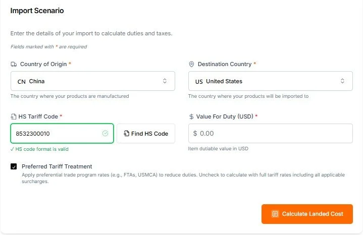 Let’s look at an import scenario using TariffBuster™. In this instance we will be importing $10,000 USD in capacitors from China for use in assembling high-end audio equipment in the US.
